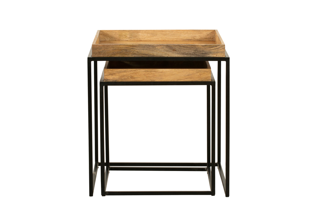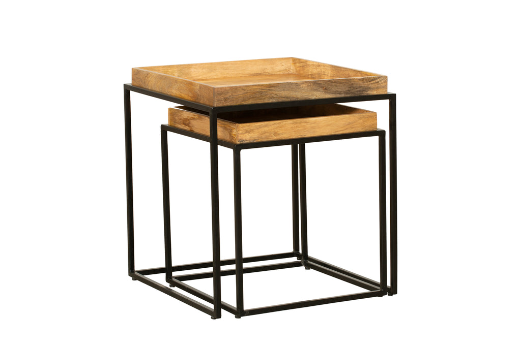 Die Tischplatten aus massivem, recyceltem Mangoholz sind jeweils Unikate und bringen natürliche Wärme in den Raum. Das schwarze Stahlgestell sorgt für einen modernen, industriellen Kontrast und eine stabile Basis. Dieses Set ist eine optimale Ergänzung für jedes Wohnzimmer.