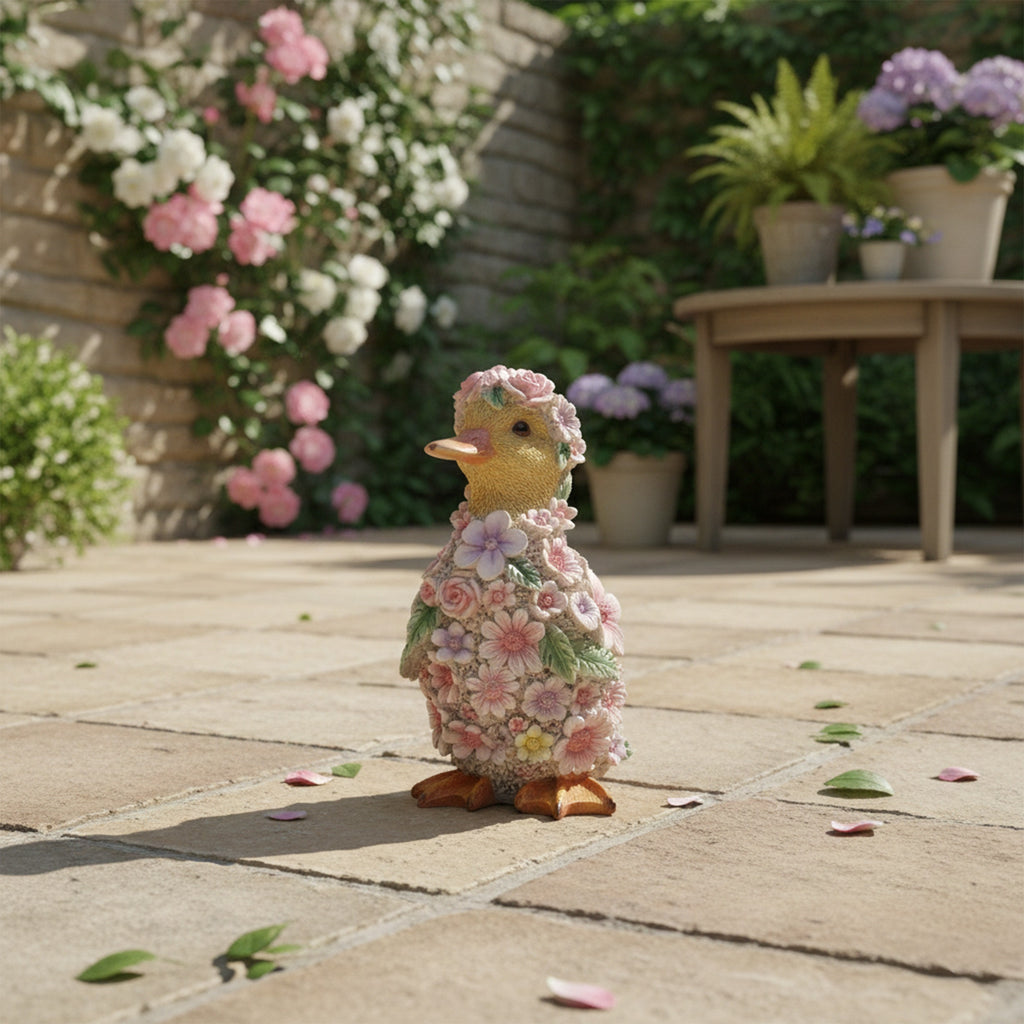 Ob auf dem Wohnzimmertisch, im Wintergarten oder auf der Terrasse – die wetterfeste Figur macht überall eine gute Figur. Das hochwertige Material erlaubt eine flexible Platzierung, während die detailgetreue Gestaltung mit Blüten ein charmantes Ambiente schafft.
