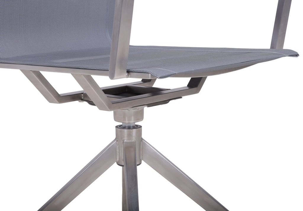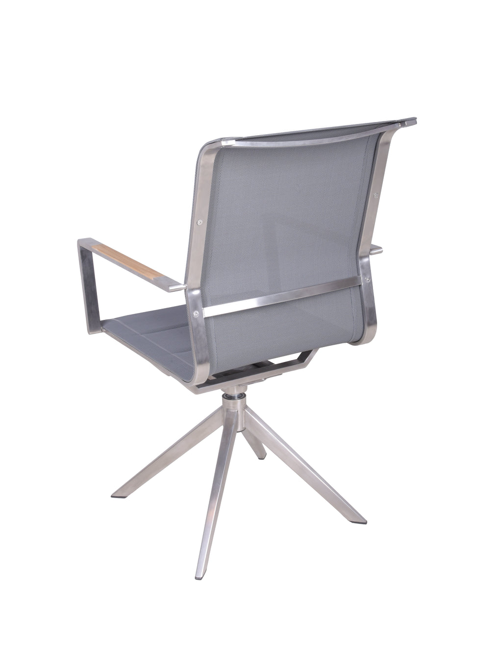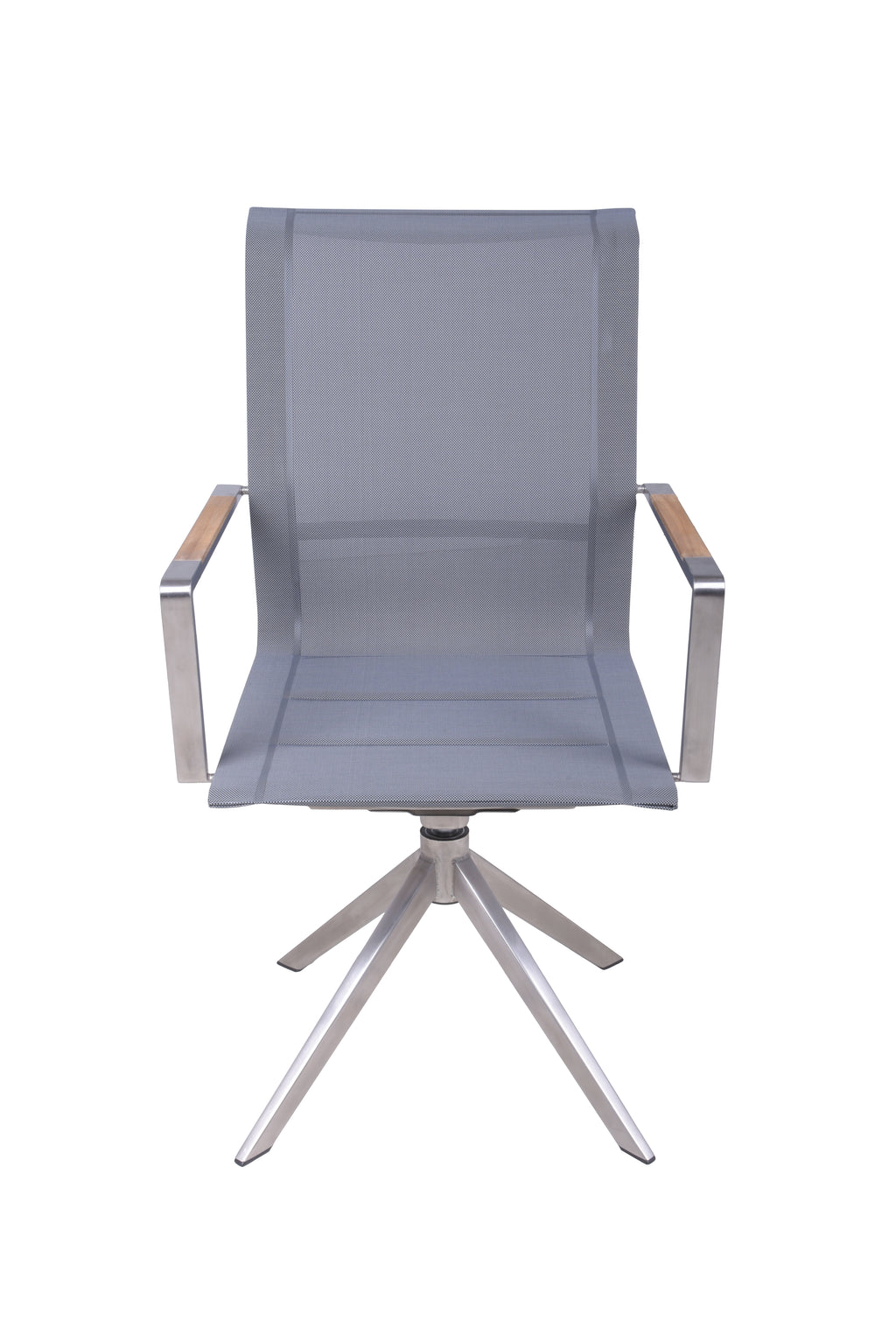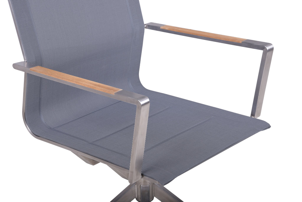 Die Materialwahl ist auf Langlebigkeit und Stil ausgelegt: Robustes Edelstahl-Gestell, strapazierfähiges Kunststoffgewebe in Grau und elegante Armlehnen aus massivem Teakholz. Ein Stuhl, der sowohl ästhetisch als auch funktional überzeugt.