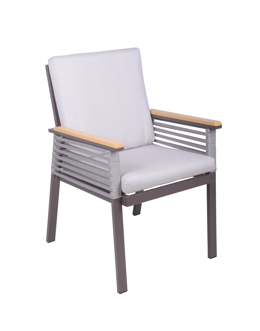Hergestellt aus hochwertigem, pulverbeschichtetem dunkelbraunem Aluminium und Armlehnen mit natürlicher Non-Wood-Oberfläche, ist dieser Stuhl eine hochwertige und ansprechende Sitzgelegenheit, die sowohl bequem als auch langlebig ist.
