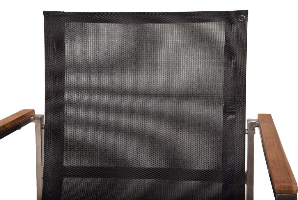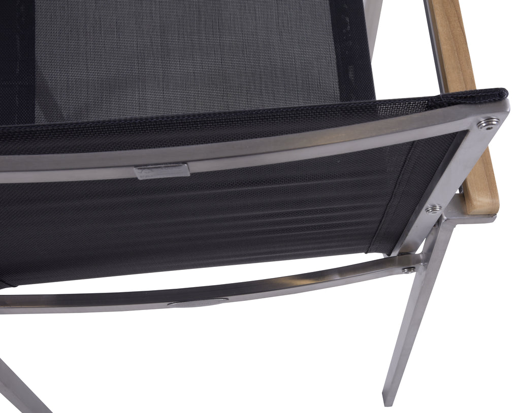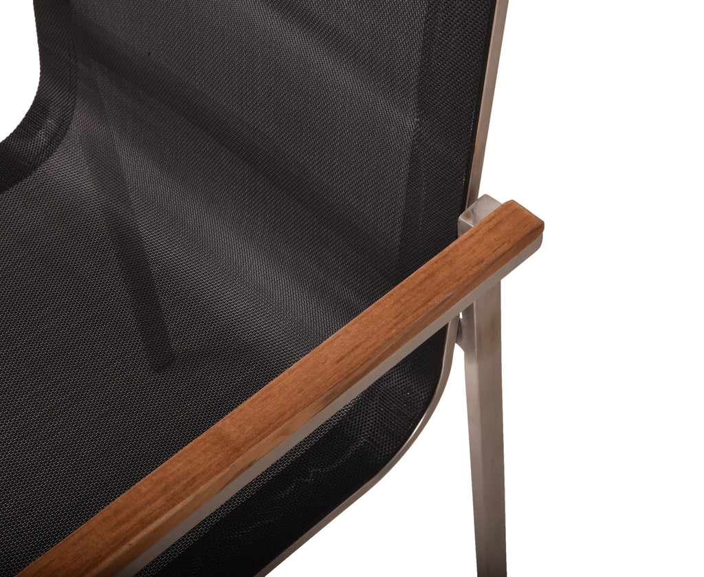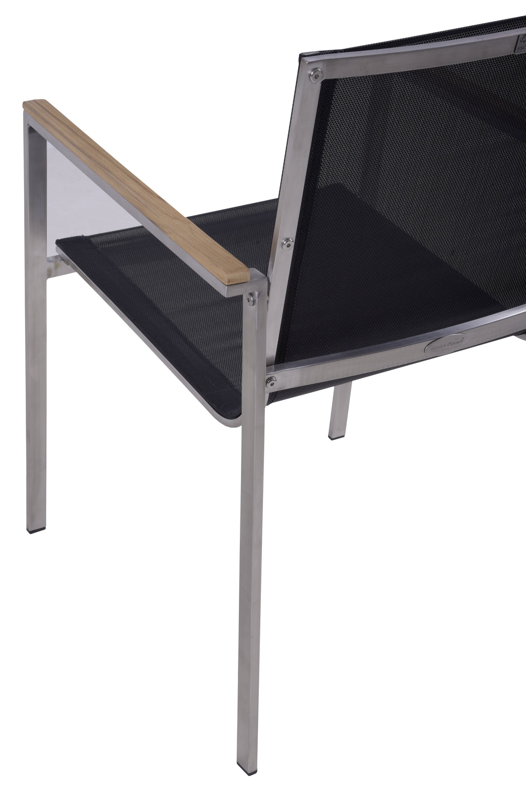 Das dunkelgraue Kunststoffgewebe ist strapazierfähig und wetterbeständig. Das Gestell aus gebürstetem Edelstahl 304 in Kombination mit Armlehnen aus FSC-zertifiziertem Teakholz bietet nicht nur eine zeitgemäße Optik, sondern auch Langlebigkeit und Nachhaltigkeit.