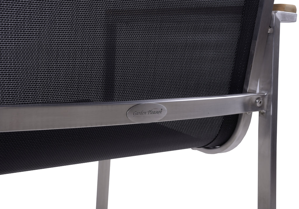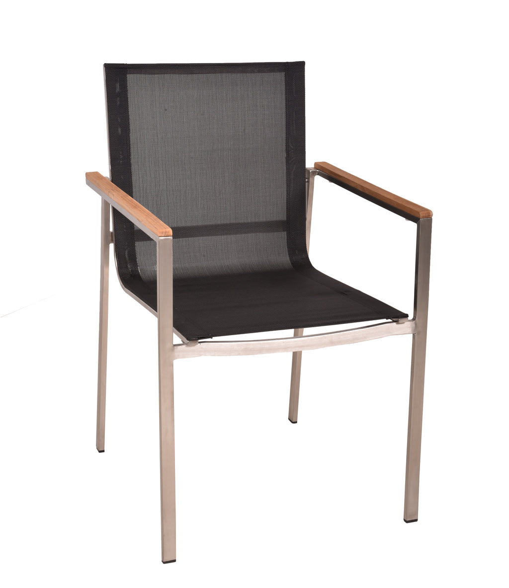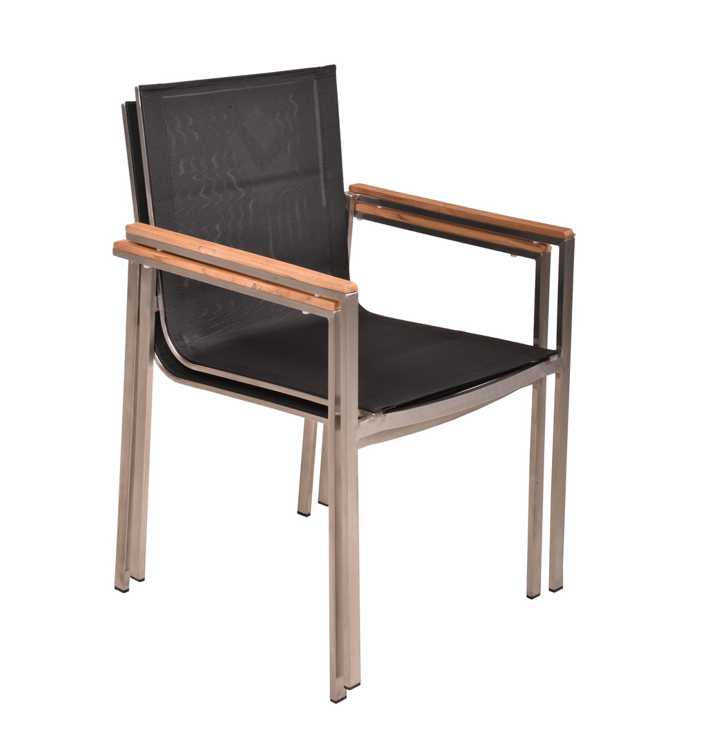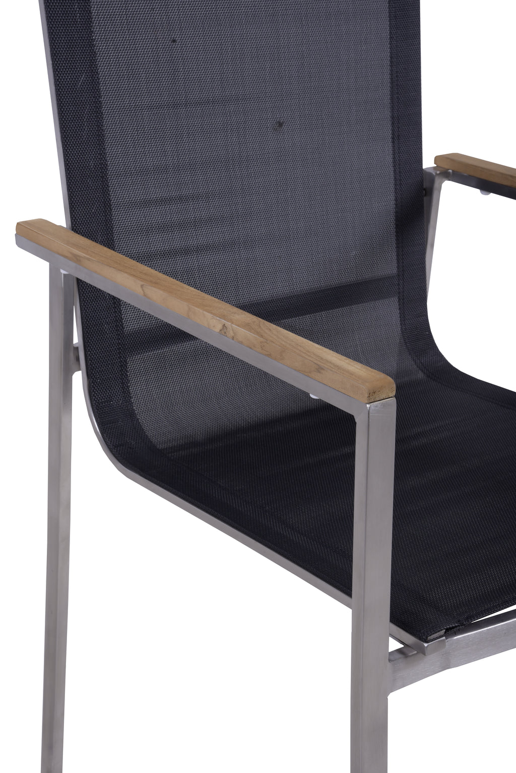 Das dunkelgraue Kunststoffgewebe ist strapazierfähig und wetterbeständig. Das Gestell aus gebürstetem Edelstahl 304 in Kombination mit Armlehnen aus FSC-zertifiziertem Teakholz bietet nicht nur eine zeitgemäße Optik, sondern auch Langlebigkeit und Nachhaltigkeit.