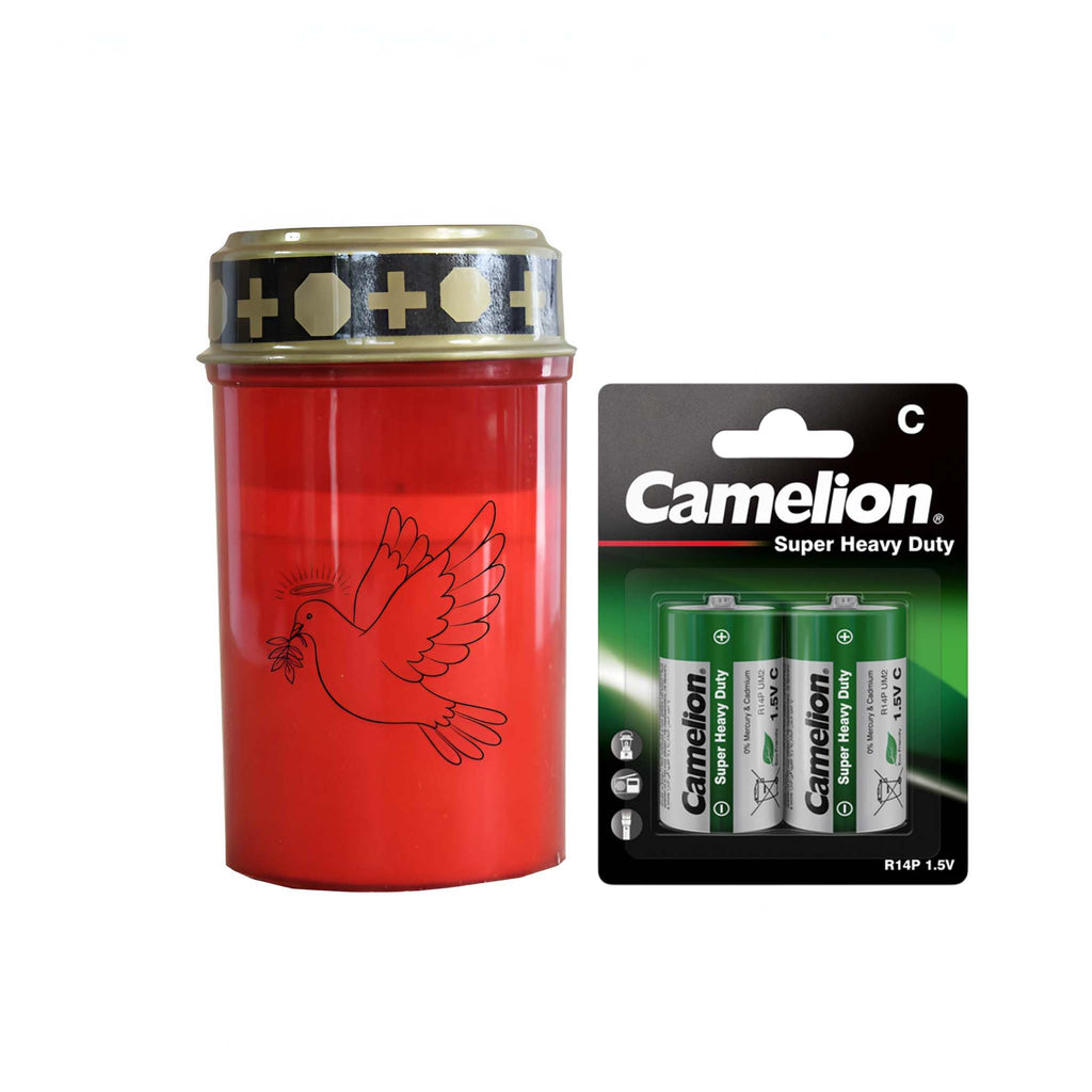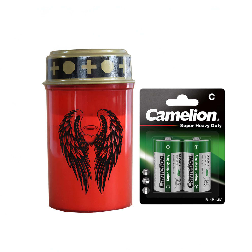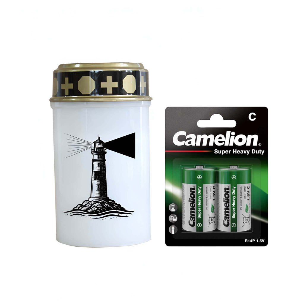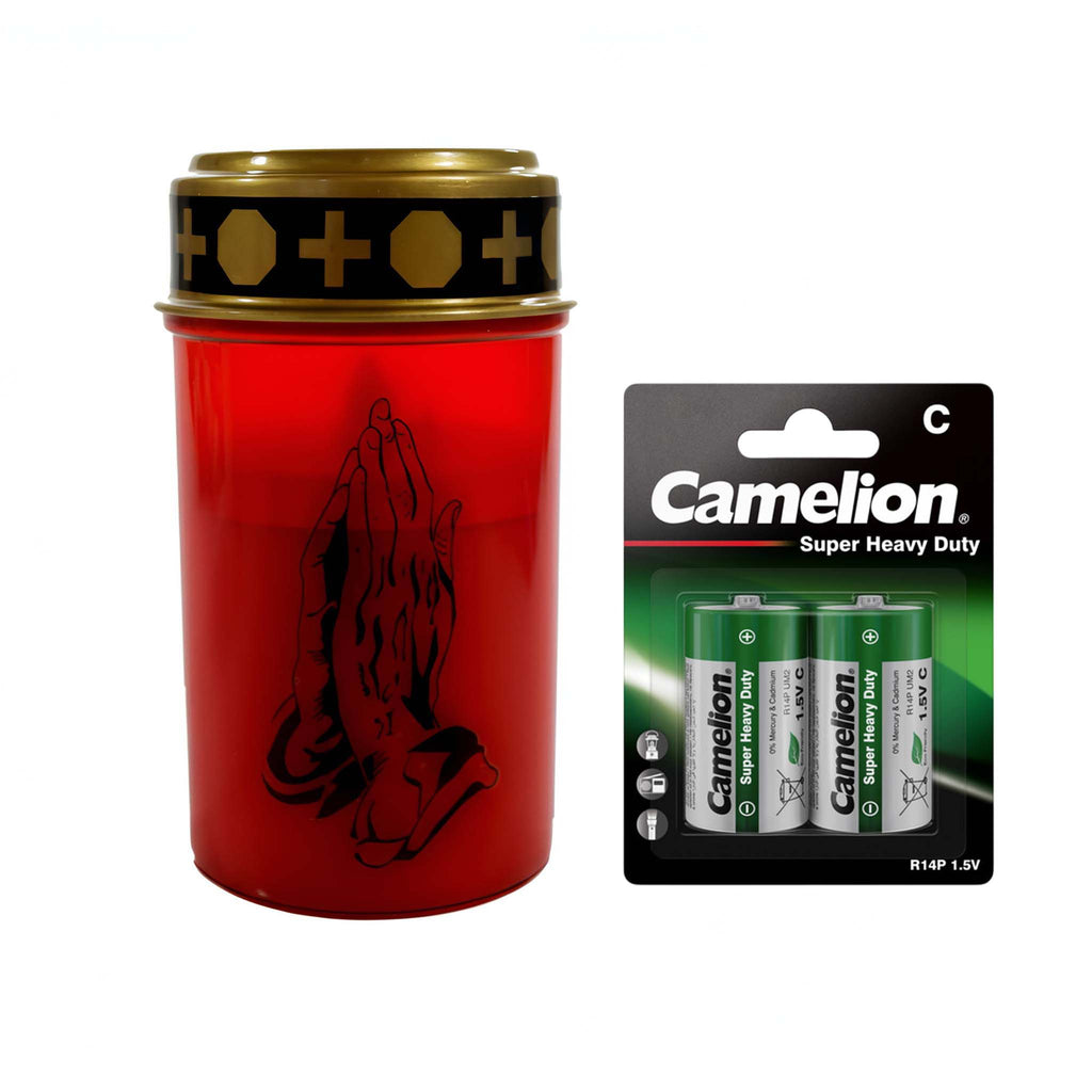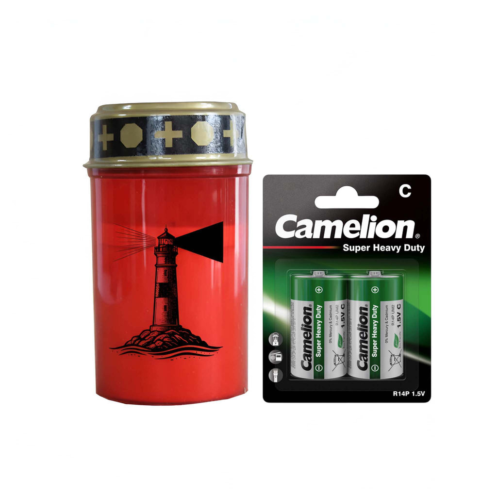 🔋 Leistungsstarke Camelion Batterien – jede Grabkerze wird mit 2× Baby LR14 Batterien des Modells Super Heavy Duty R14 C geliefert. Mit 1,5V Spannung, 2500 mAh Nennkapazität und Einsatztemperaturen von –18 °C bis +55 °C bieten sie eine besonders lange Leuchtdauer und zuverlässige Funktion auch bei Kälte.