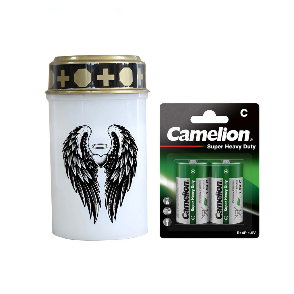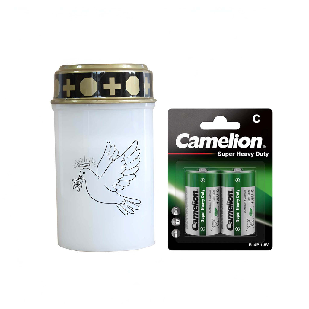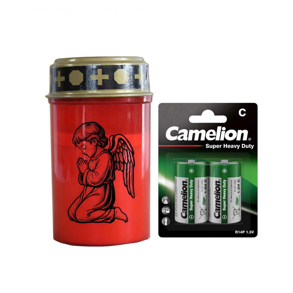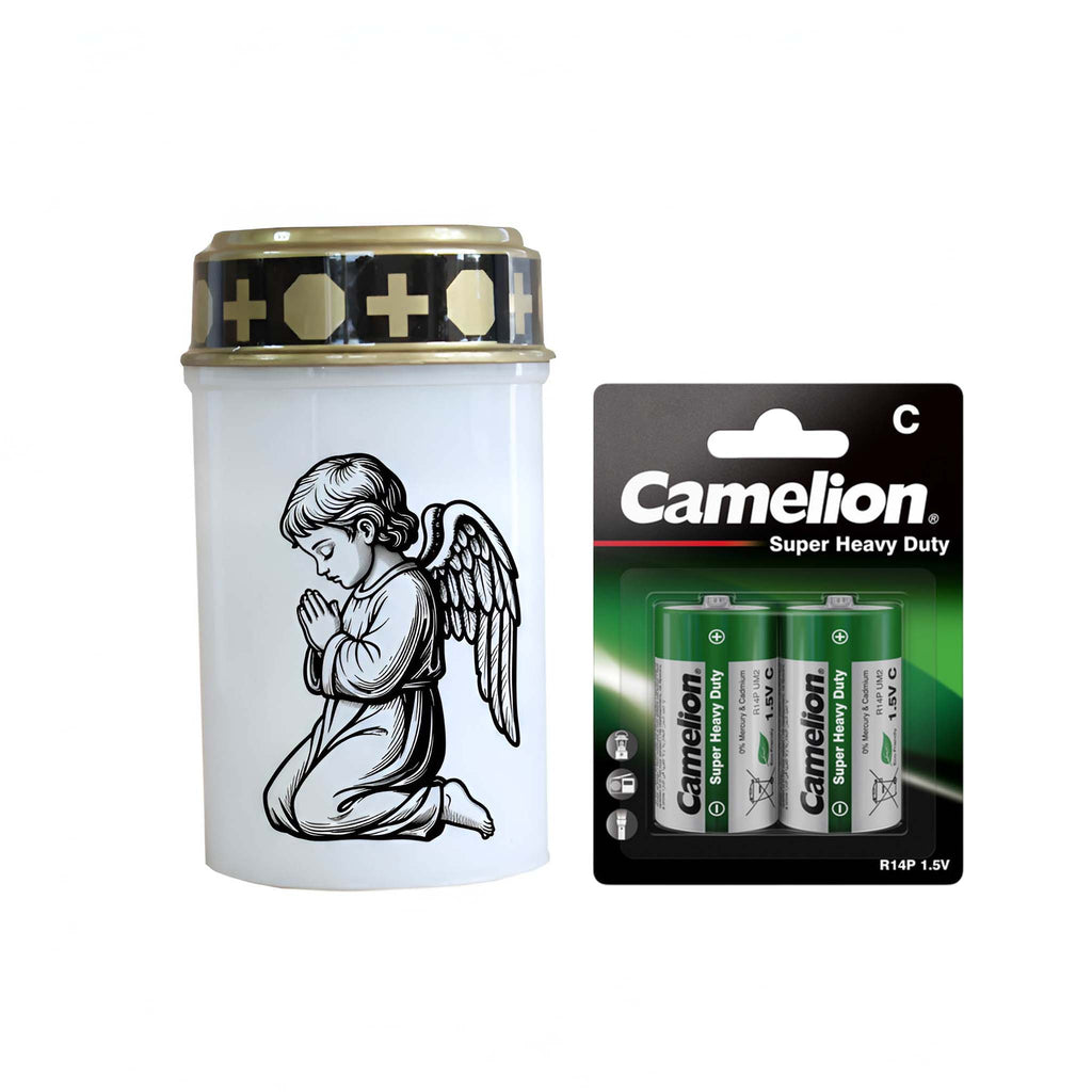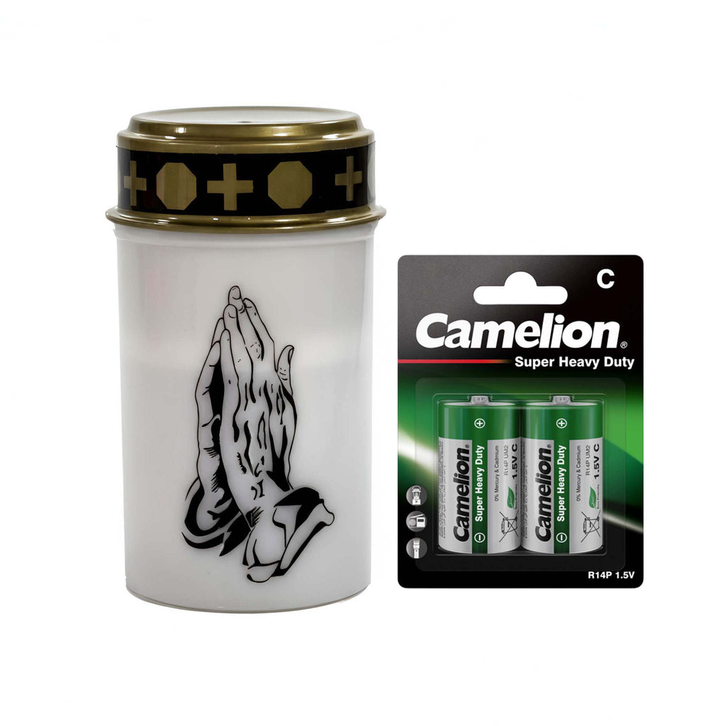 🔋 Leistungsstarke Camelion Batterien – jede Grabkerze wird mit 2× Baby LR14 Batterien des Modells Super Heavy Duty R14 C geliefert. Mit 1,5V Spannung, 2500 mAh Nennkapazität und Einsatztemperaturen von –18 °C bis +55 °C bieten sie eine besonders lange Leuchtdauer und zuverlässige Funktion auch bei Kälte.