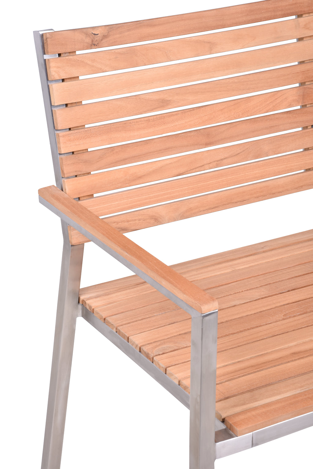 Gefertigt aus wetterfestem Edelstahl und nachhaltigem Teakholz, ist diese Bank für den ganzjährigen Einsatz im Freien konzipiert. Die pflegeleichte, geölte Oberfläche des Holzes bewahrt die natürliche Schönheit und schützt vor Witterungseinflüssen.
