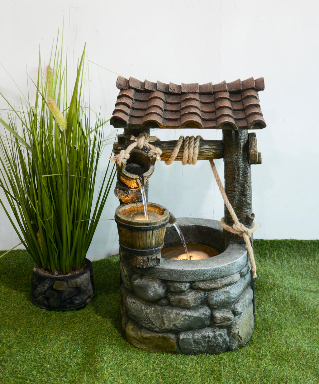 Die Verwendung von Polyresin und Fiberglas garantiert eine langlebige und pflegeleichte Konstruktion. Der Brunnen ist wetterfest und UV-beständig, sodass seine natürliche Optik dauerhaft erhalten bleibt. Die Installation ist dank des mitgelieferten Zubehörs unkompliziert.